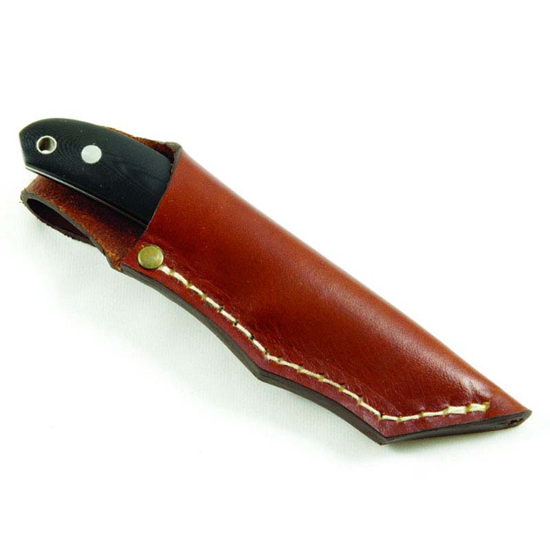 Comes with a sturdy leather sheath. The design in combination with the materials used makes this a very beautiful but highly resilient piece of kit. Ideal as a small skinner for small deer and as a small belt knife for safari hunters.
