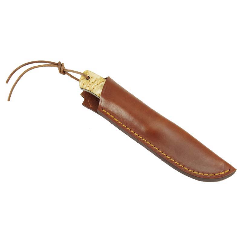 The blade is made of around 4mm thick Böhler K720 high carbon tool steel to make the blade extremely durable for heavy use such as log-splitting, or so-called "batoning" without making the knife to heavy or uncomfortable to carry. The knife has a Scandinavian grind to make it very robust at the same time easy to carve wood and easy to sharpen on a small flat whetstone/sharpener in the forest.