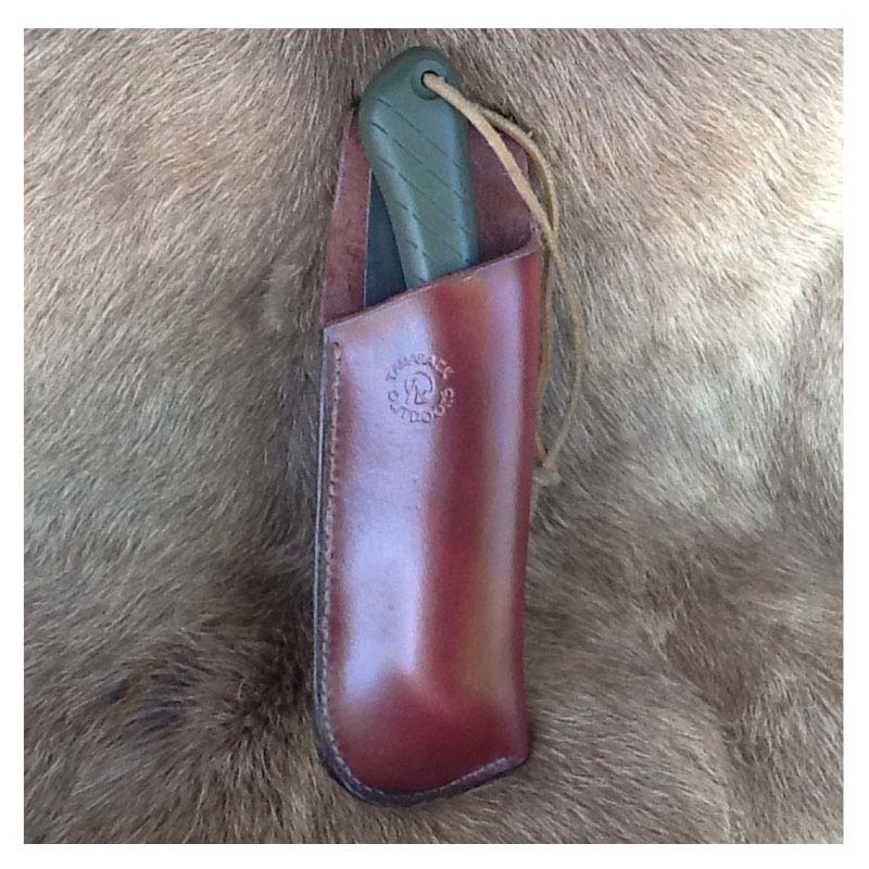 The sheath is constructed from 3mm cow hide, hand stitched and finished with the Tamarack Outdoors logo on the front.