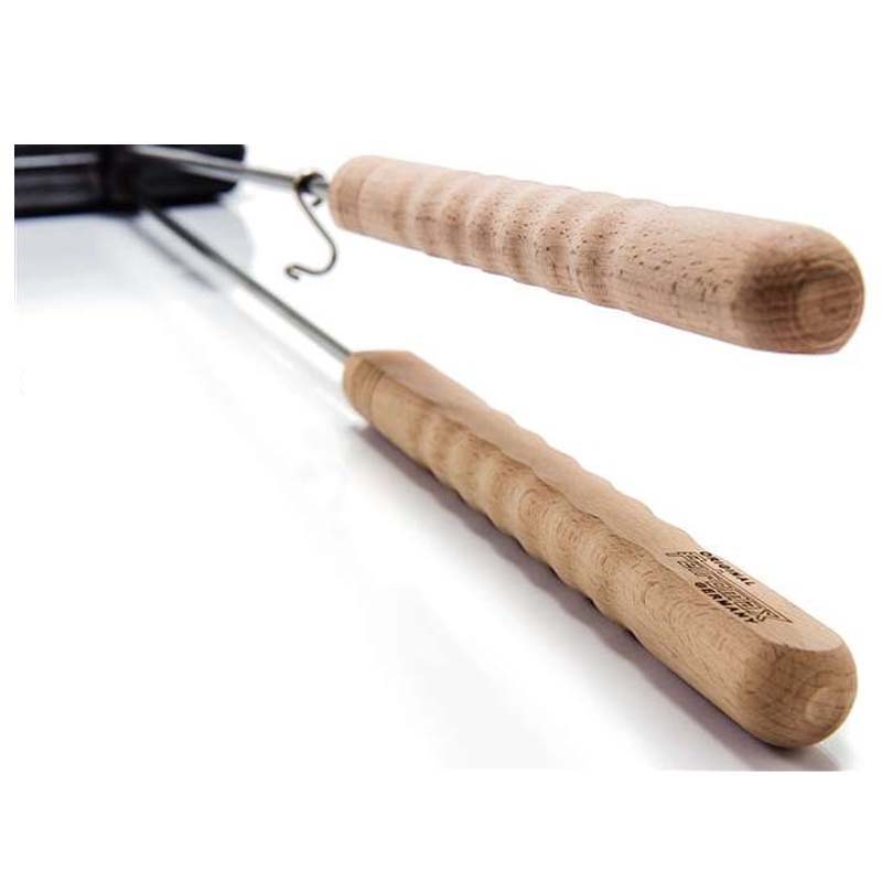 The wooden handles fit comfortably in the hand, and the long rodensures enough distance from the source of heat. The cast iron can beused immediately, for it is provided with what is called a seasonedfinish. For cleaning, you simply separate the cast-iron halves thanksto the hinge. When cleaning, you enjoy the amazing properties of castiron, for it has a natural anti-adhesive effect.