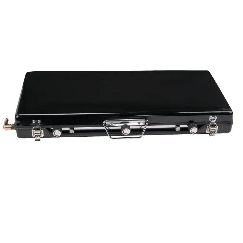 Large double hob and grill family camping stove, that folds into a low profile self-contained case for transport.