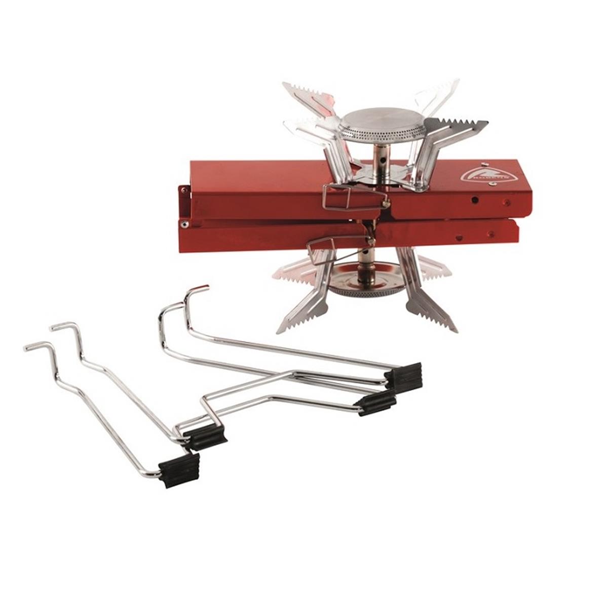 DescriptionDouble burner stove that uses screw in gas canisters for fuel.