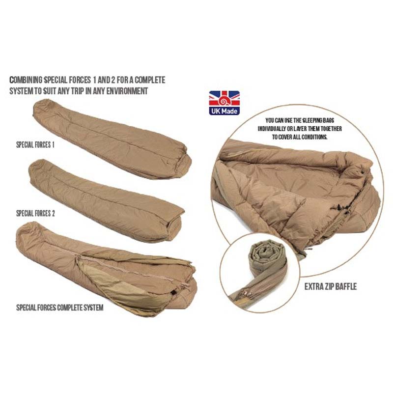 The Complete System gives you the Special Forces 1 Bag for use in above freezing temperatures and the Special Forces 2 Bag for use in temperatures right down to -10°C. Then, when you’re in extreme conditions, you place the Special Forces 2 Bag inside the Special Forces 1 Bag and join them together with the extra zip baffle, so you’re protected in conditions right down to -20°C. Ingenious!