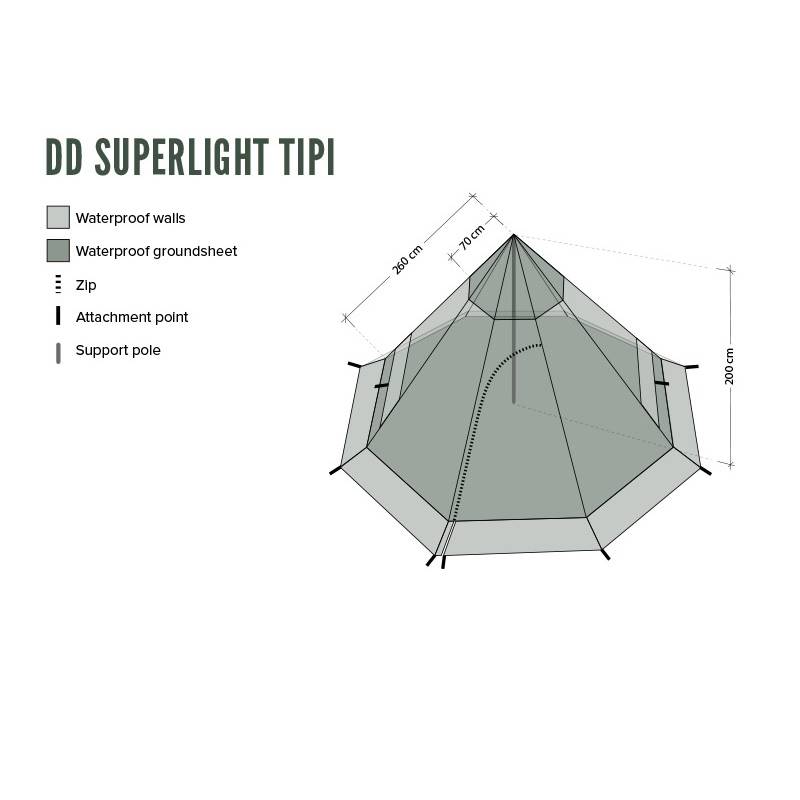 Consisting of a single-layered body, and separate floor, the DD Superlight Tipi employs just a central adjustable pole (included) to raise the centre, and 19 pegs (27 included) to attach the tent floor/peg out the sides, allowing it to be quickly and easily set up (even by one person).