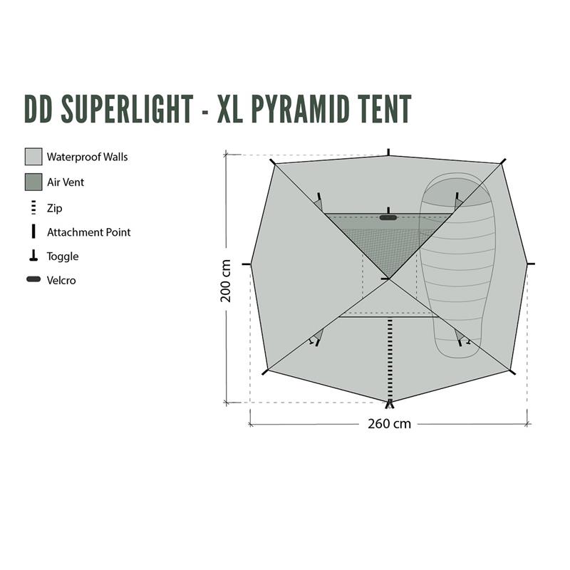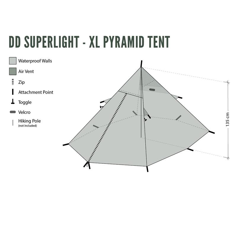 The DD SuperLight -XL Pyramid Tent is designed to be used in conjuction with either the DD SuperLight - XL - Pyramid Mesh Tent or the DD SuperLight - Solo Mesh Tent (both sold separately, for pairs or single campers respectively) to provide insectproofing, but can be used by itself for a spacious waterproof shelter.