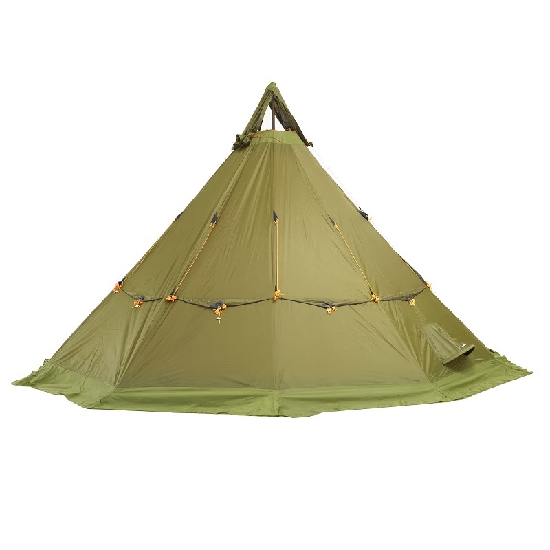 Here we have combined years of experience and knowledge about both tent and lavvu. The result was a lavvu with details like an adjustable inner-tent you can easily lower from the inside to increase heat retention, a permanent floor with opening for fire or cold pits, storm flaps, lots of guy lines and peg points for increased stability, and two entries with mosquito mesh and protected zippers.