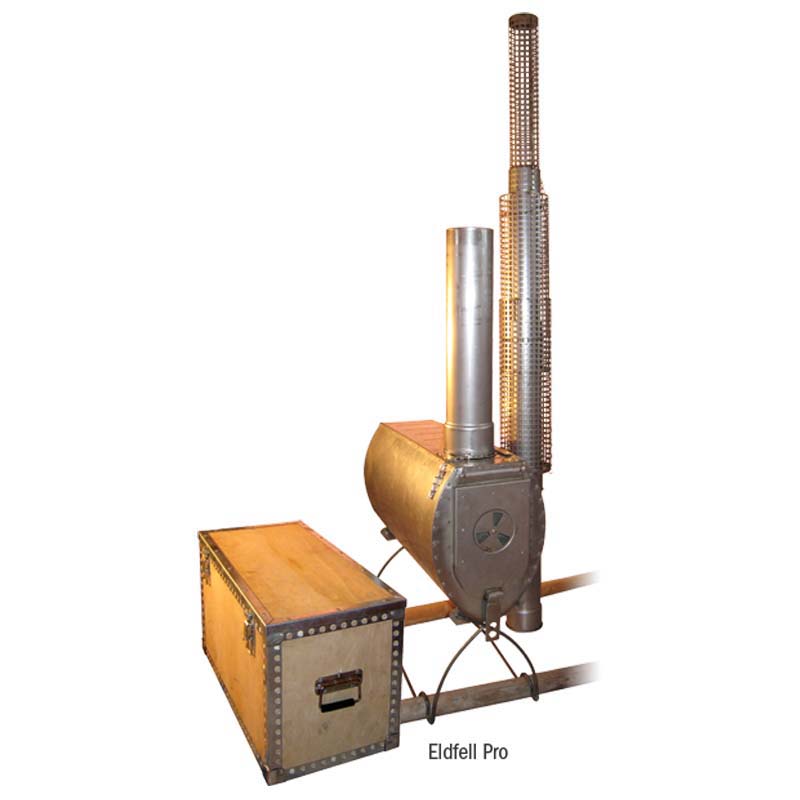 Eldfell is available in stainless steel (Pro). It fits Adventure tipi sizes 5, 7, 9 and 15 using the same combustion chamber but different chimney lengths. Eldfell Pro comes in its own purpose-made wooden box.