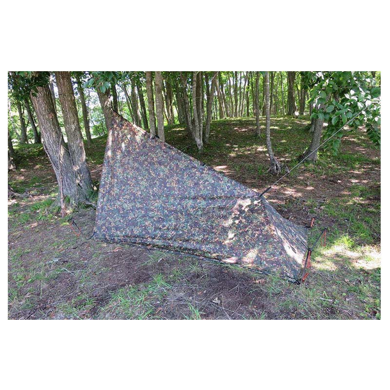 Blend in with this camping shelter! Recommended for hammock campers of all experience levels, the DD Tarp 3x3 offers reliable protection wherever you go. Its 19 reinforced attachment points offer a huge number of setup options, and it's the tarp of choice for bushcraft & survival schools, the armed forces and countless wild campers worldwide!