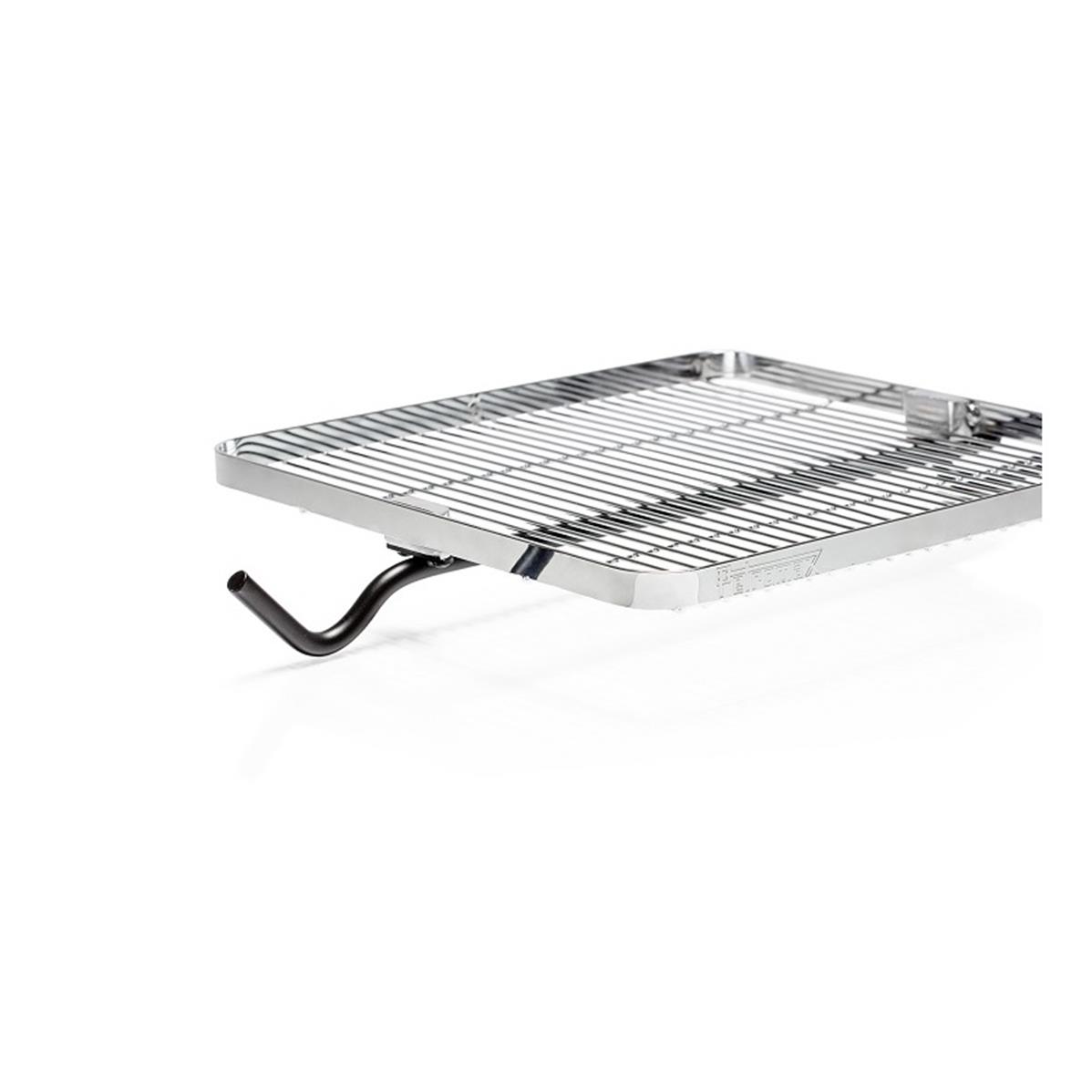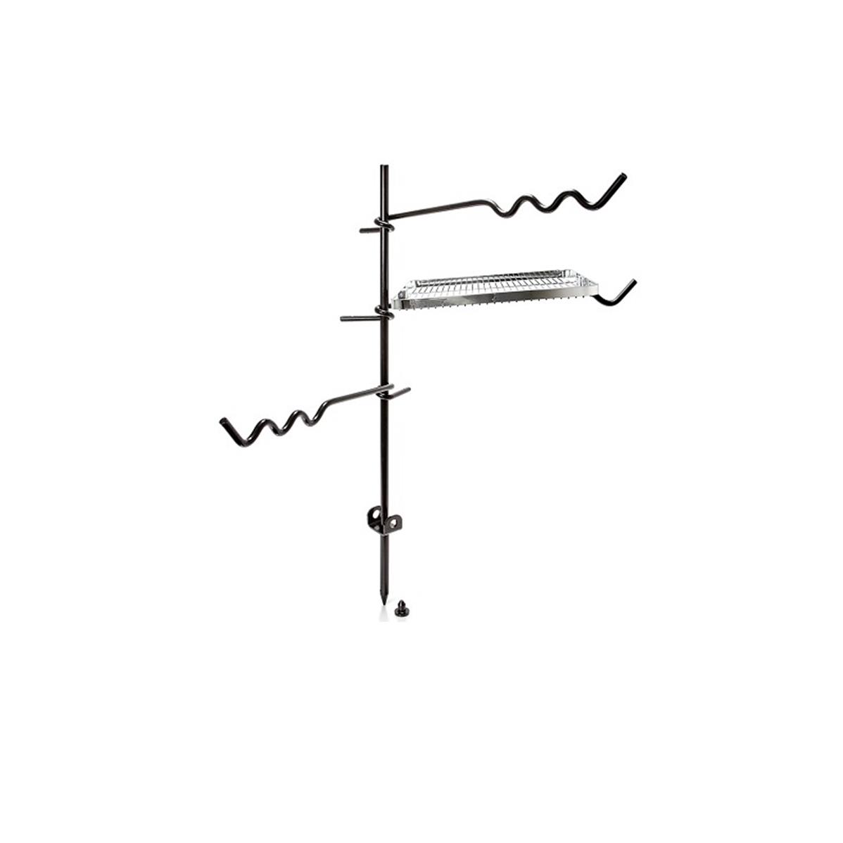 The Fire Anchor is delivered to you with a central pole, three flexible arms and a grilling grate. The grilling grate with a raised edge is to be attached to one of the arms. You can also hang barbecue gloves or the BBQ and Coal Tongs from the extra notch. Each of the other two arms has three notches from which varied cooking utensils can be hung. The arms can be placed separately on the central pole at your desired direction and height.