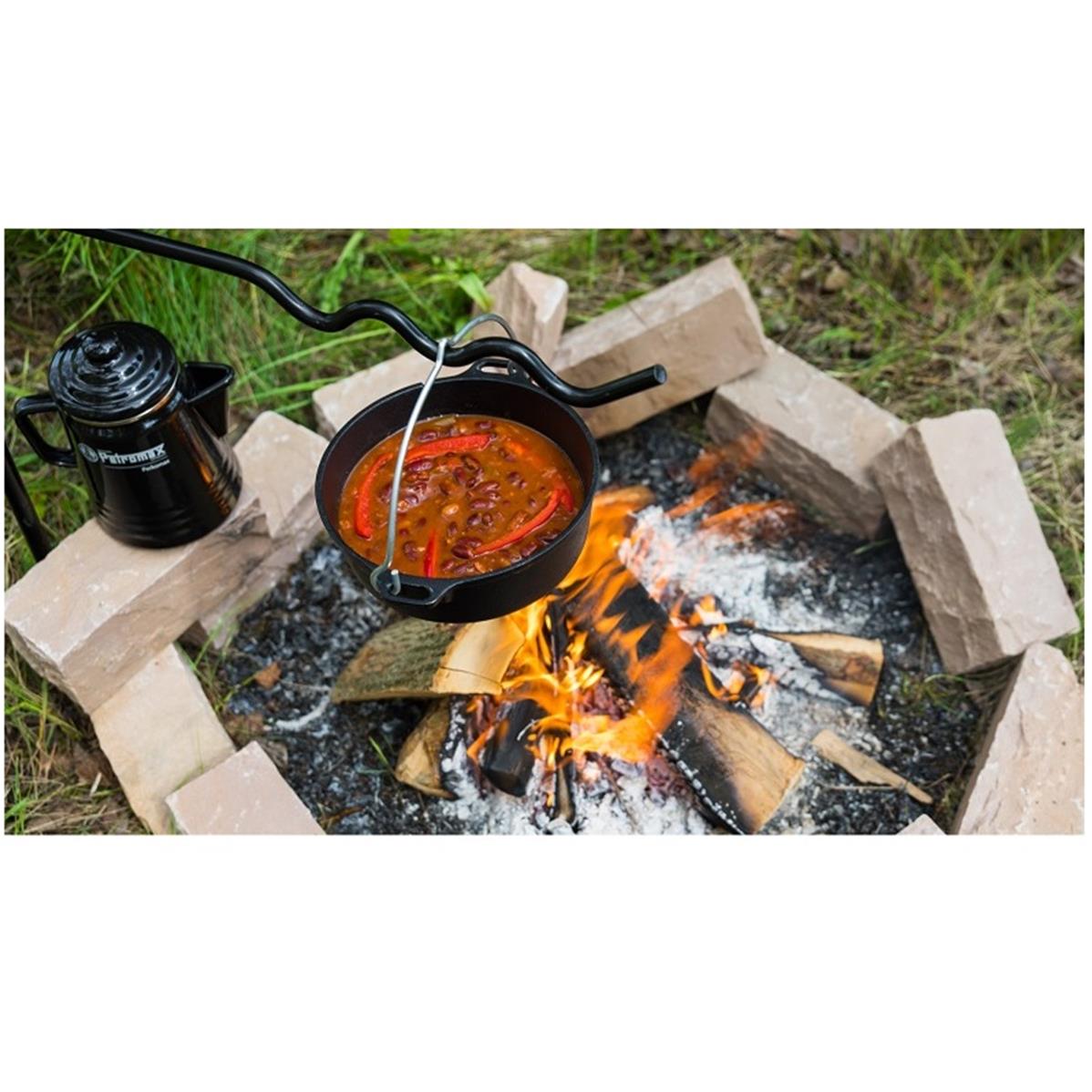 With the Petromax Fire Anchor, you will turn your campfire into a practical and versatile cooking area. The Fire Anchor made of coated steel can be easily anchored into the ground next to your campfire, the Atago or the Fire Bowl, and it offers diverse options for cooking outdoors. You can prepare delicious meals with the Dutch oven (up to size FT6 ), boil water in the Teakettle for some hot tea or grill vegetable skewers, sausages, etc. on the practical grilling grate.